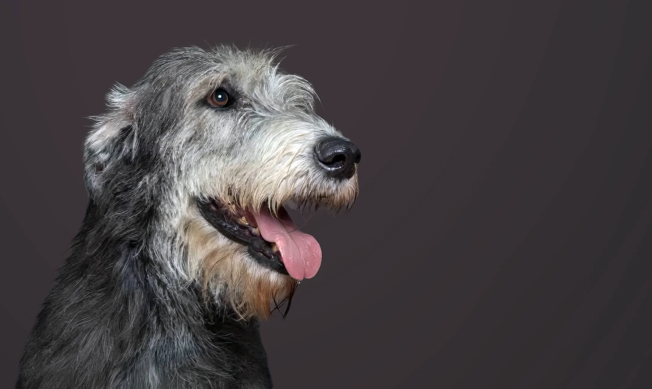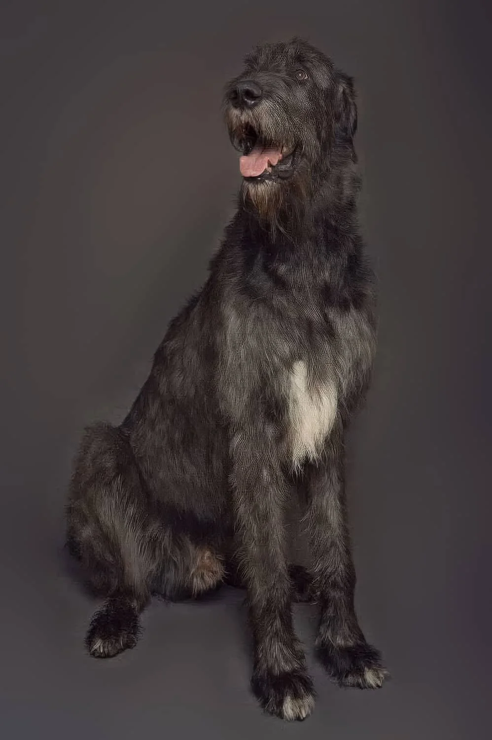 En stor hund, en irländsk varghund, med mörk päls och ljusare fläckar, sittande mot en mörk bakgrund.